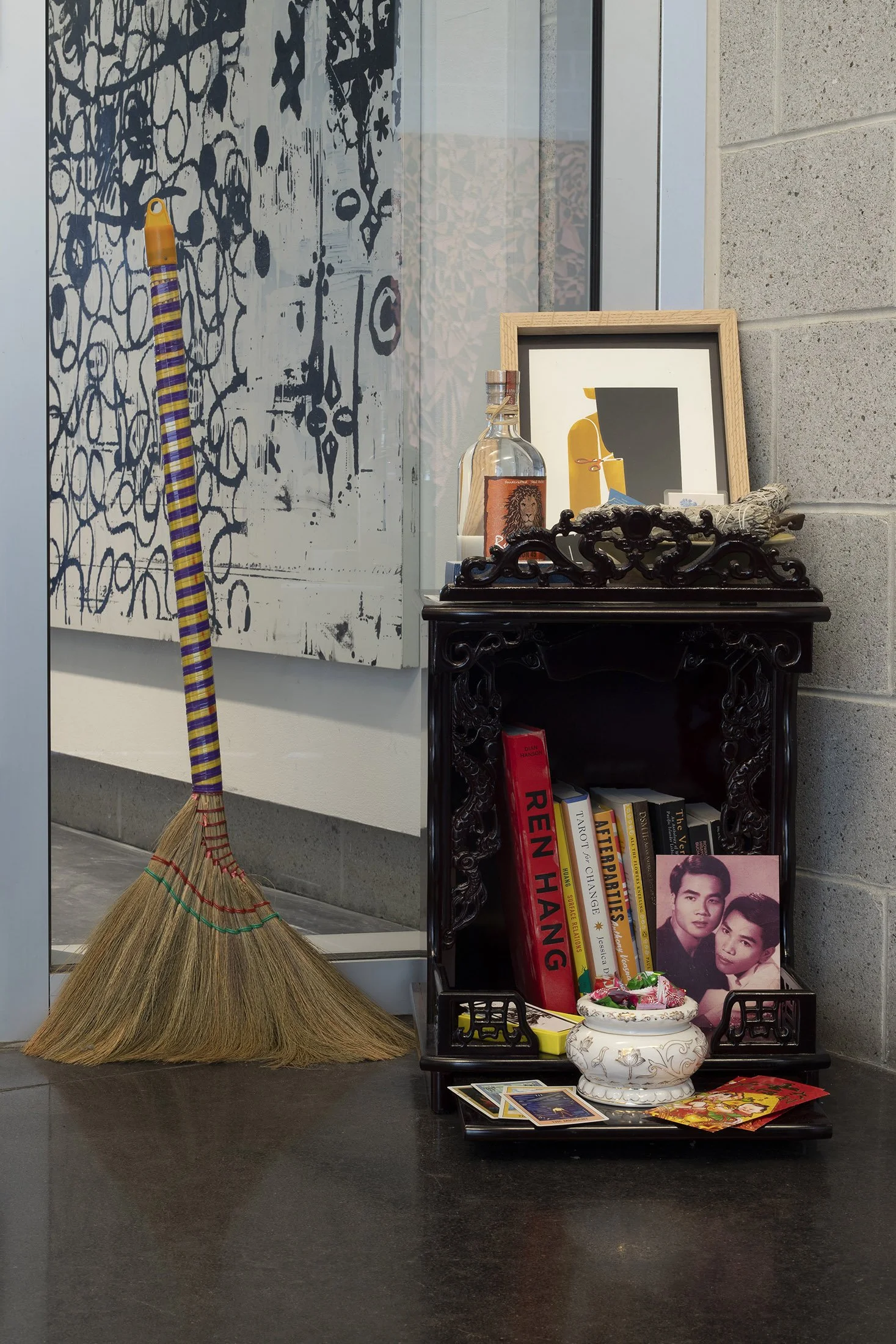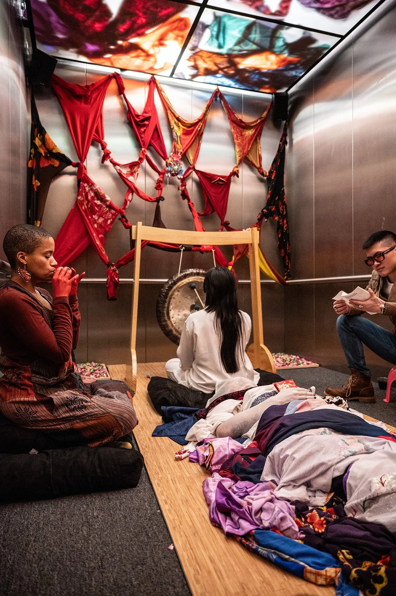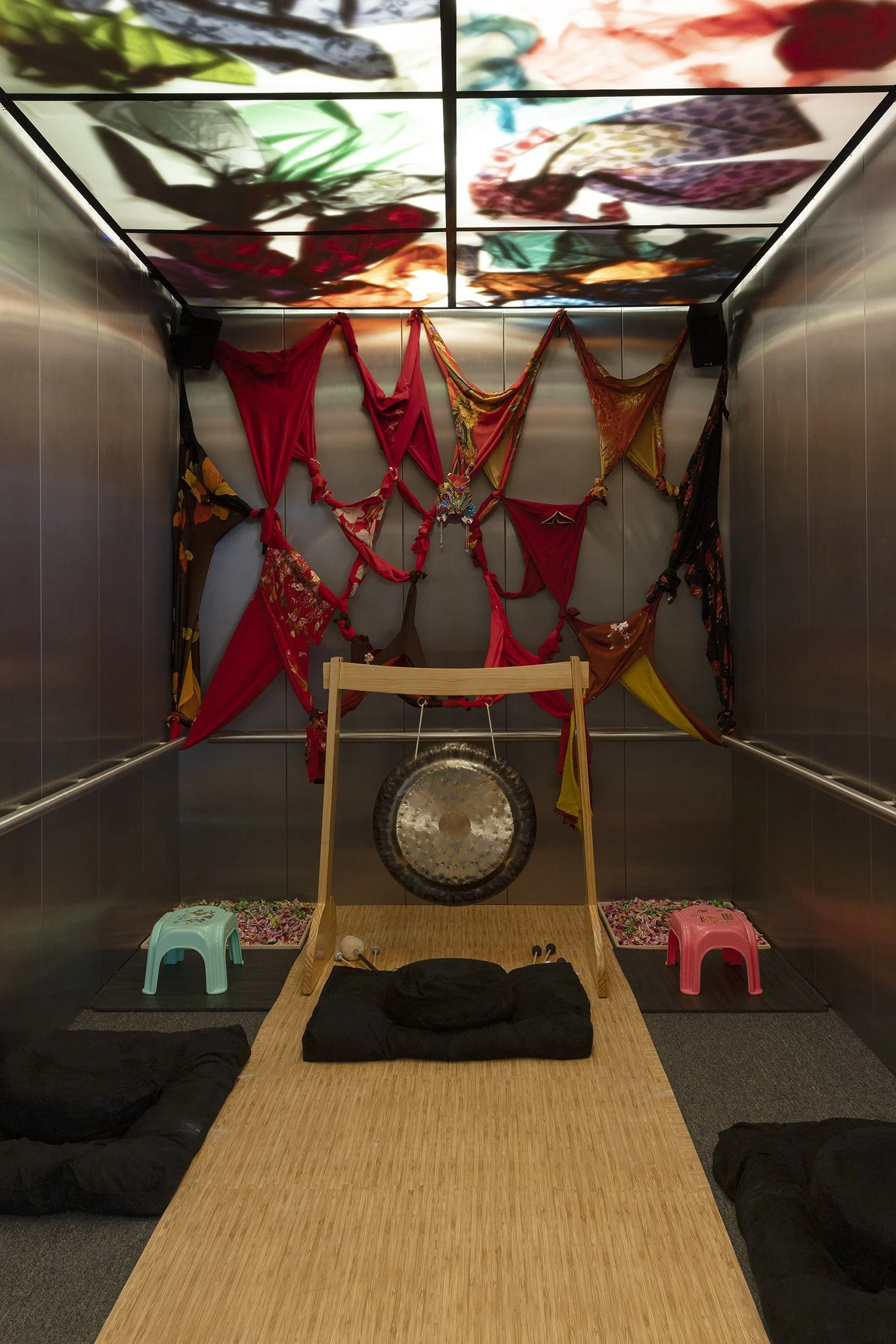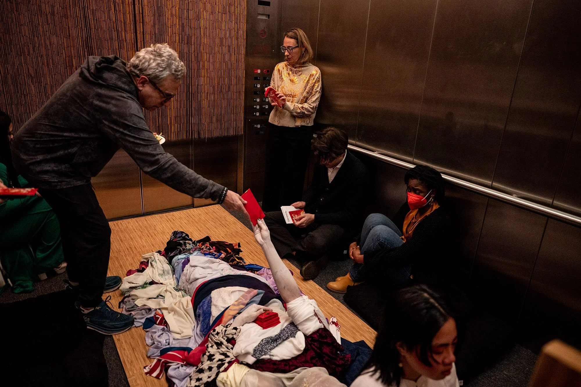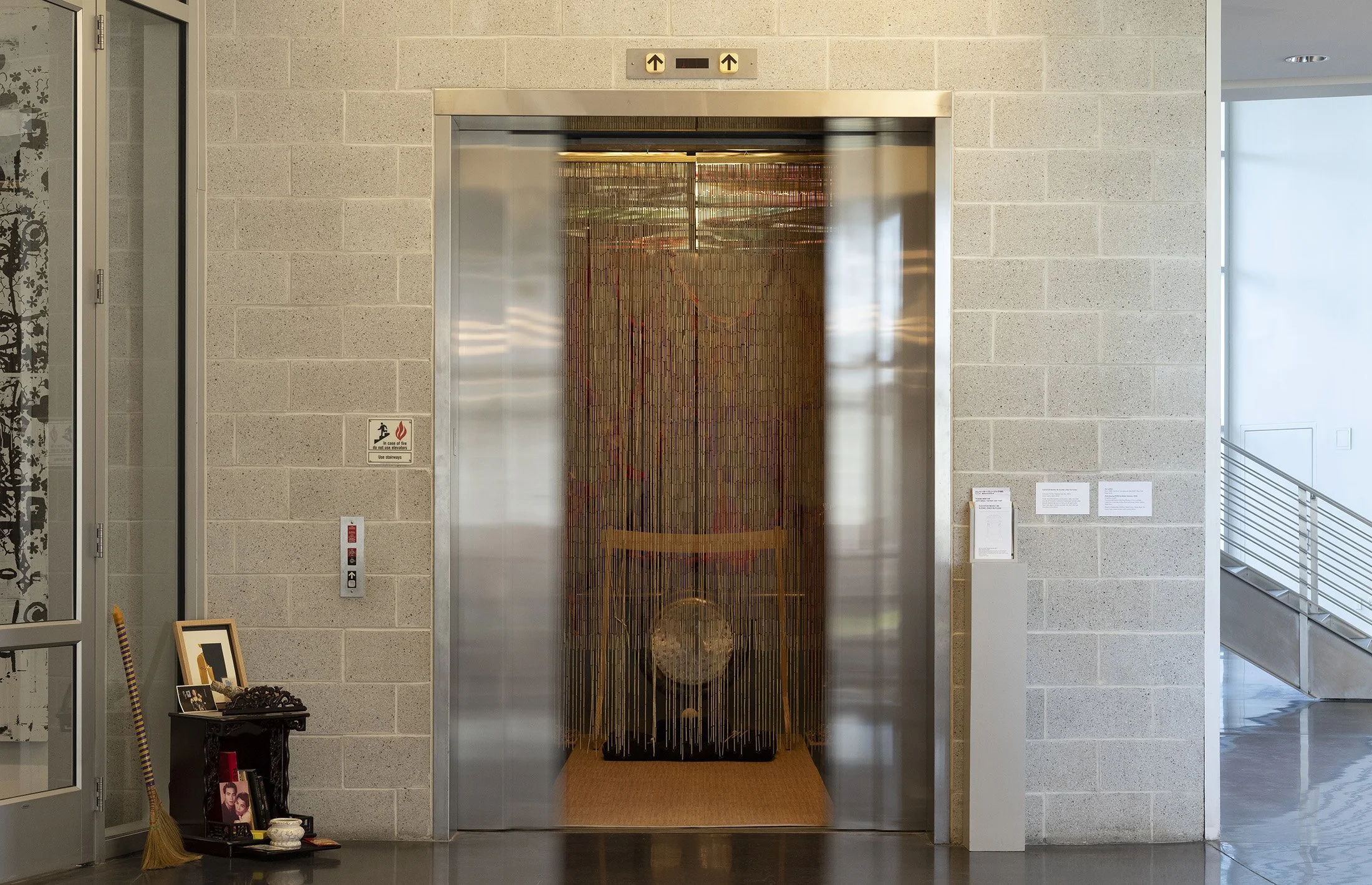 In this exhibition, Antonius-Tín Bui, Theresa-Xuan Bui, and MIZU meld the language of altars—spaces of presence, transcendence, and transmission—with the liminality of the shifting elevator and welcome all to commune with the unknown. Through a combination of spoken word poetry, experimental cello, traditional Vietnamese áo dài (garments), Southeast Asian home goods, and Asian snacks, the installation engages all five senses—aural, visual, haptic, olfactory, and gustatory.
