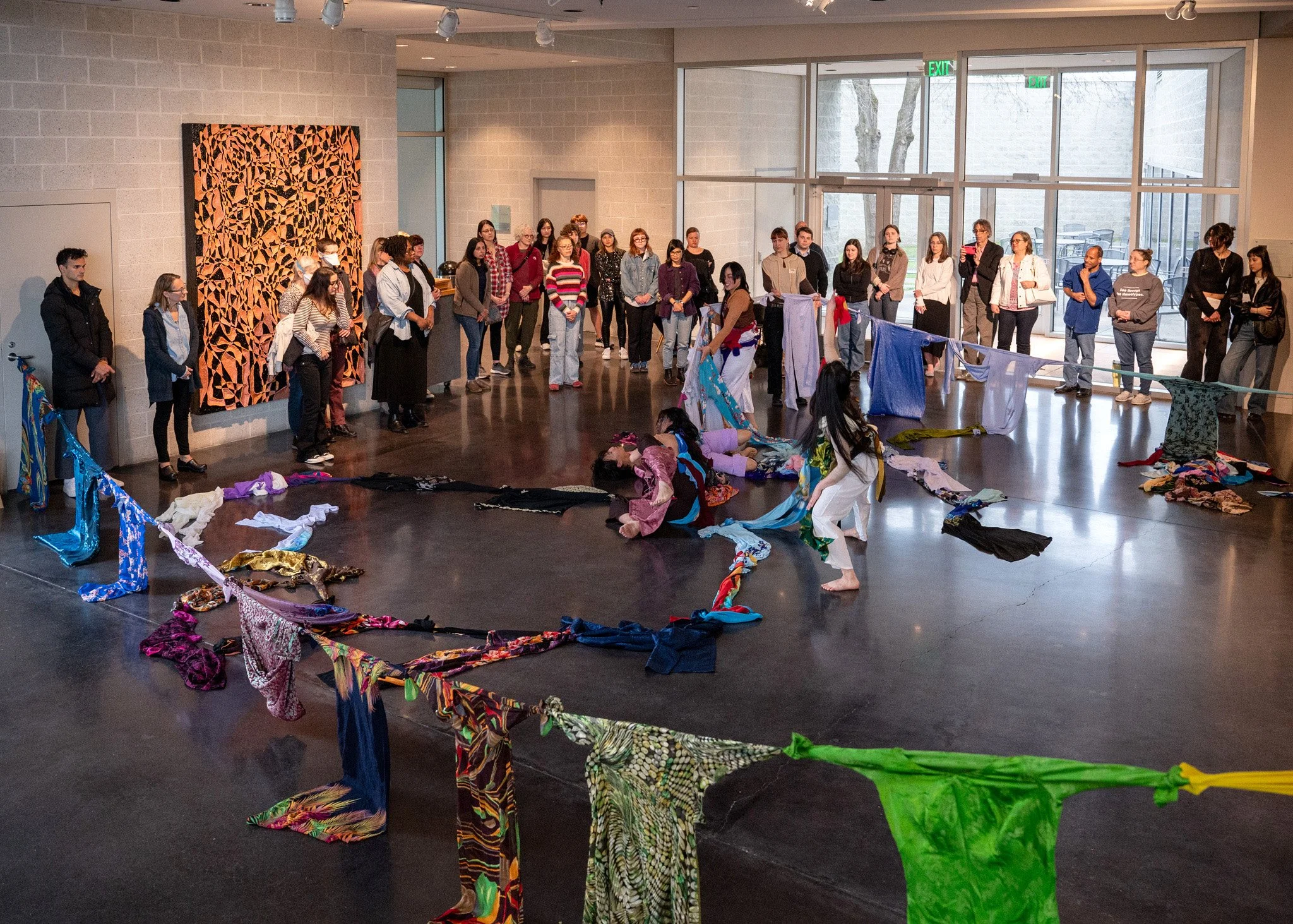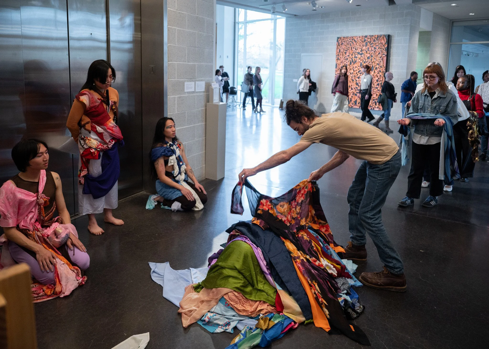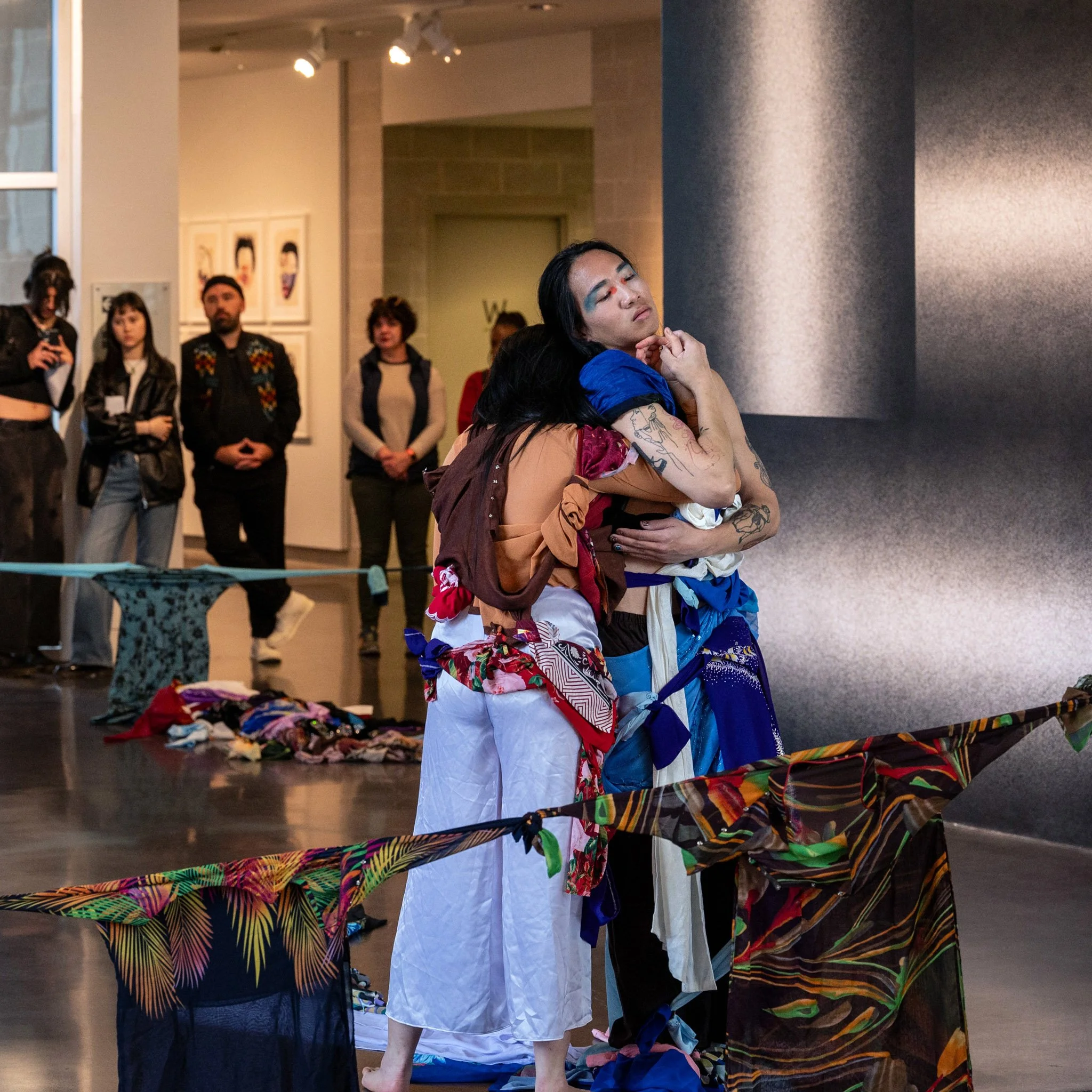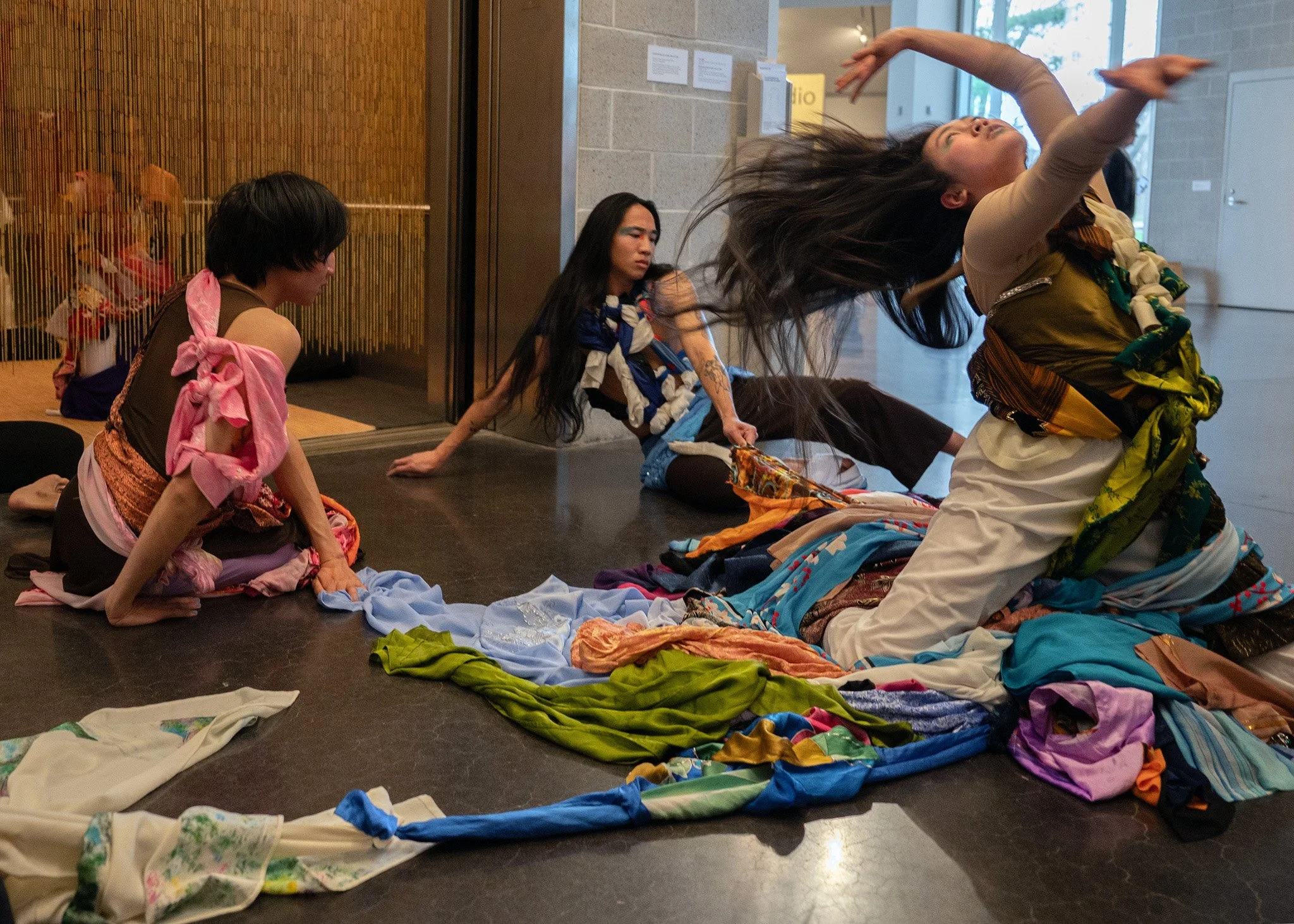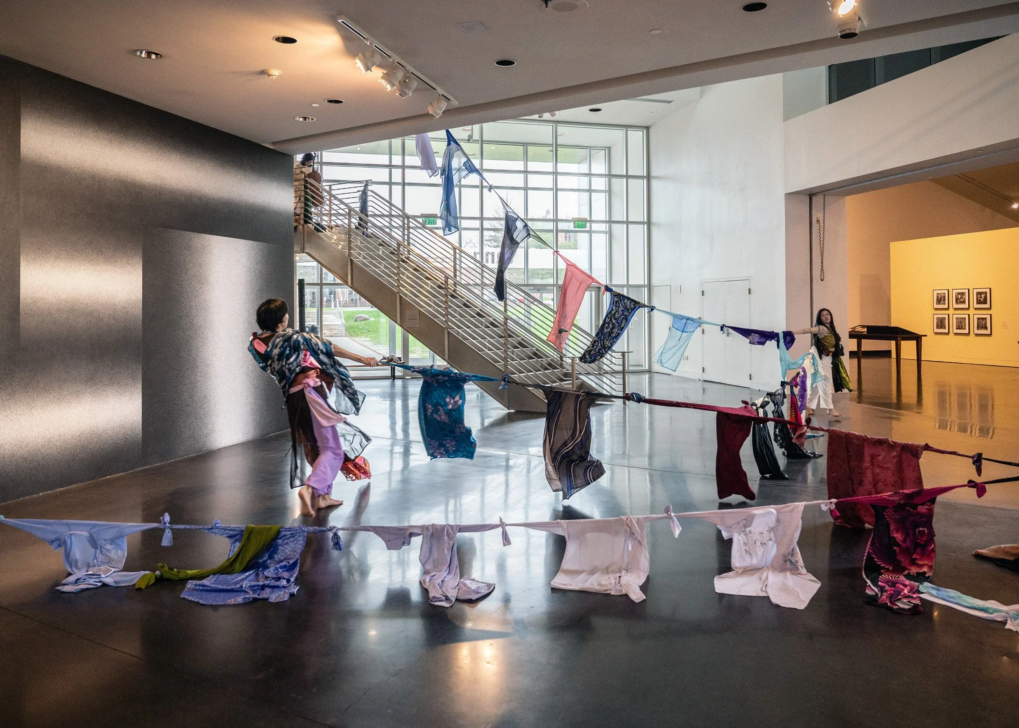 The artists activated the Tang’s elevator and staircase with cello, improvisational movement, spoken word poetry, and audience interaction with traditional Vietnamese garments (áo dài). In this way, the audience joined the diasporic artists on a migration embodying the hesitations, expectations, and contemplations of returning home.