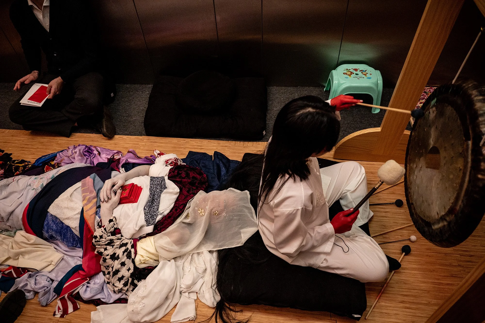 Antonius-Tín Bui and Theresa-Xuan Bui (seated, center) perform in Elevator Music 48: Alone, only in flesh, Tang Teaching Museum, 2024, photo by Megan Mumford